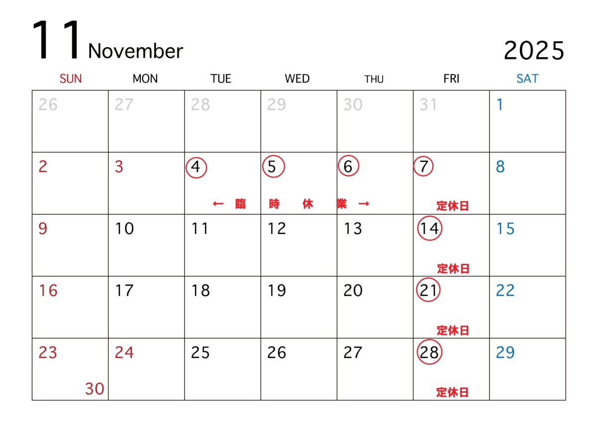 臨時休業:4日(火)・5日(水)・6日(木)です。